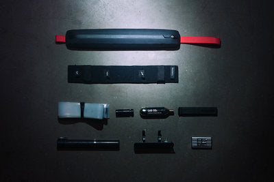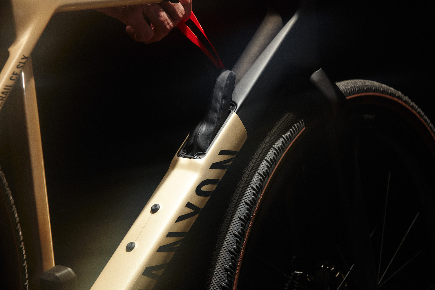 The unique design allows you to securely stash an inner tube, levers, and inflator in a special noise-dampening pouch, while your mini tool and pump lock into an integrated hatch within the downtube.