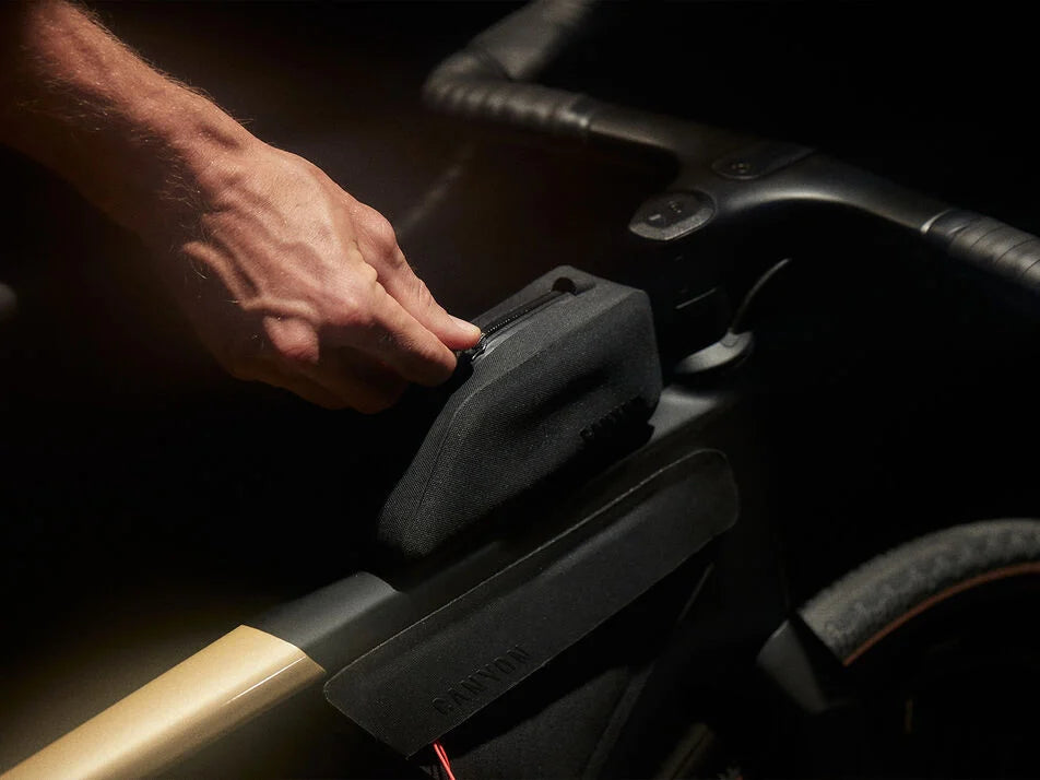 LOAD DOWN TUBE STORAGE (not for CF SL platform) with Hatch that can store a 6-piece CANYON MINITOOL and Topeak Micro Rocket, plus the LOAD TOOL PACK for addi- tional tyre levers, CO2 cartridge, CO2 Inflator and TPU inner tube.