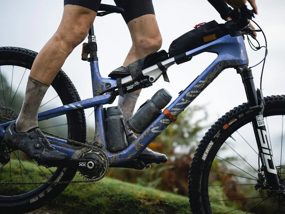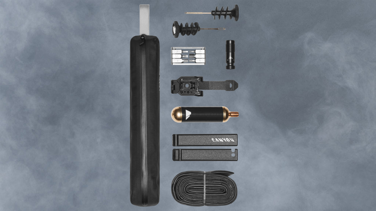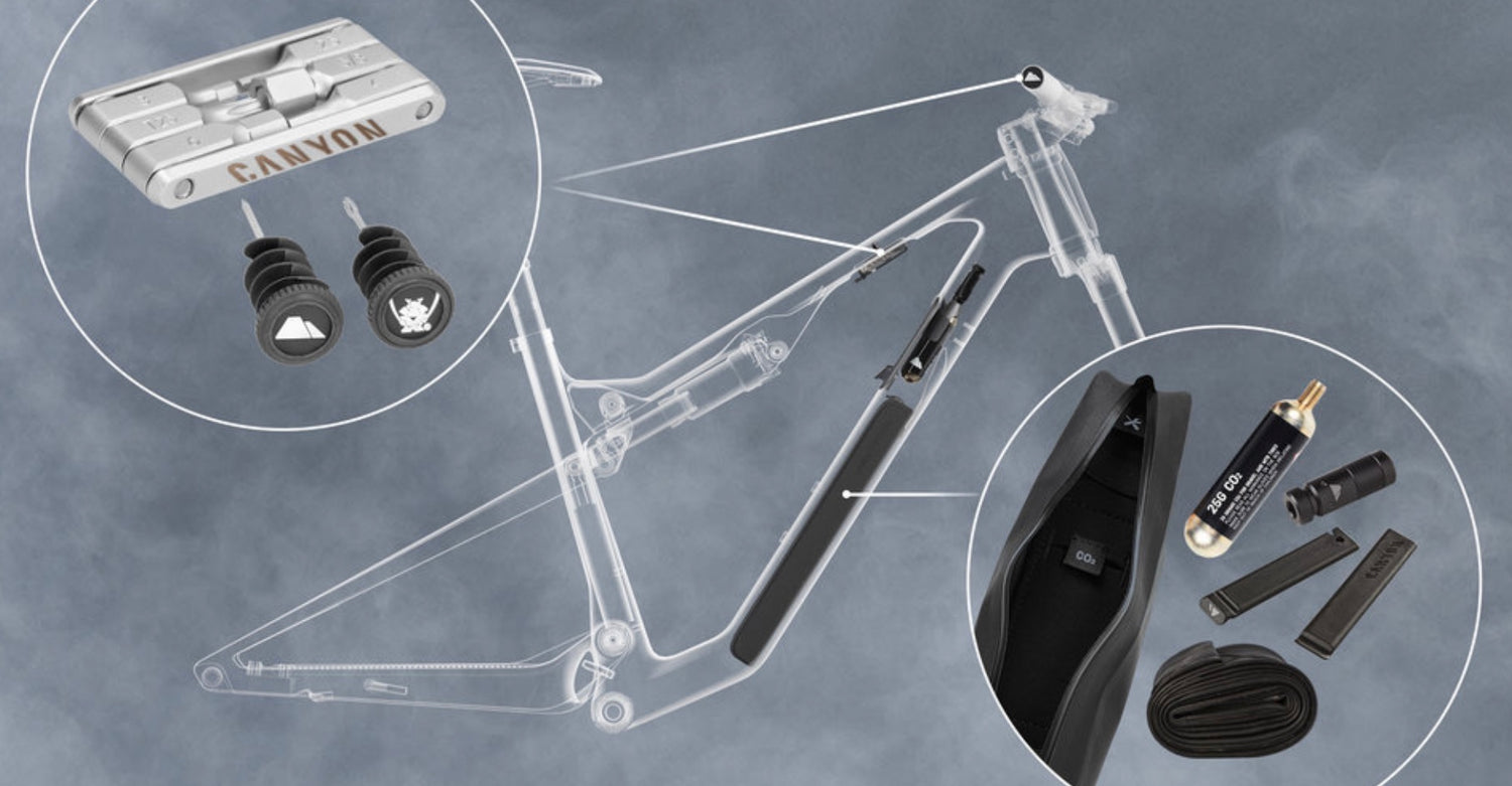 Take your wheel off with the tool-free Quickle and grab the Canyon LOAD Tool Pouch from the down tube storage when you get a flat and get going again with the CO2 cartridge, levers, tube, and whatever else you like.