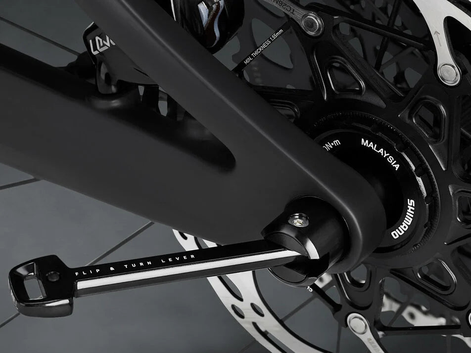 Easily take your rear wheel off with the tool-free and cleanly integrated Quixle. All of the stiffness of a rear thru-axle without any of the hassle.