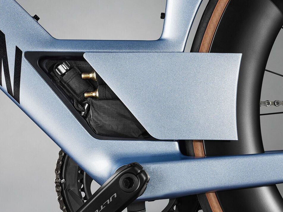 The bottom bracket box gives you storage for inner tubes or additional bike maintenance kit. Part of the frame’s carbon structure, it’s made from ultra-rare Toray MX40 carbon fibre and contributes to improving the frame’s aerodynamics stiffness.