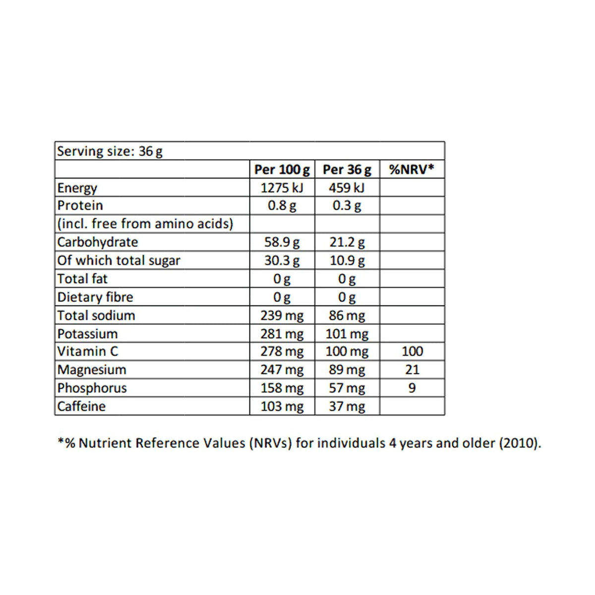 Maltodextrin syrup, Reversed osmosis water, Fructose, Magnesium lactate, Pectin citrate, L-taurine, Potassium citrate, Di-sodium phosphate,