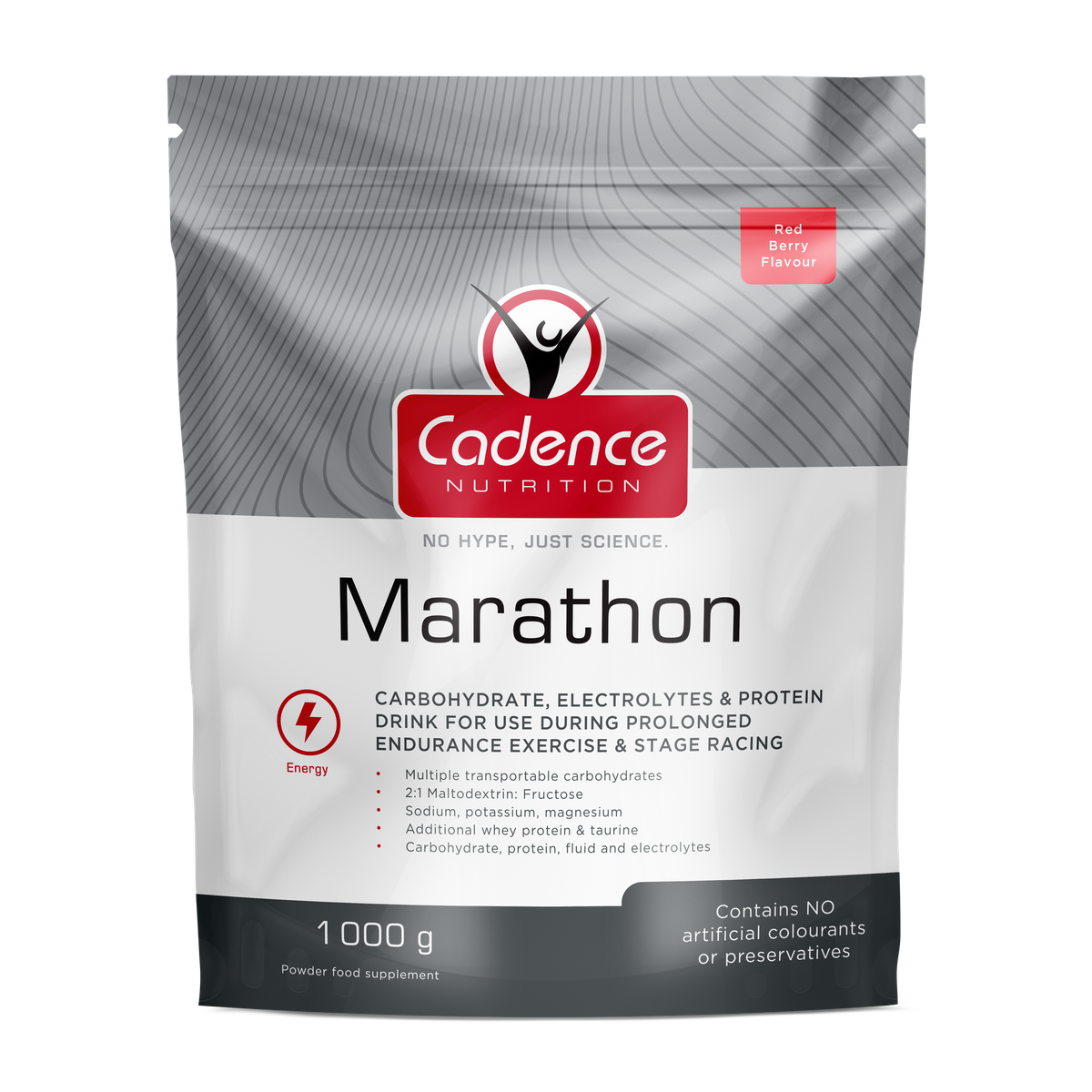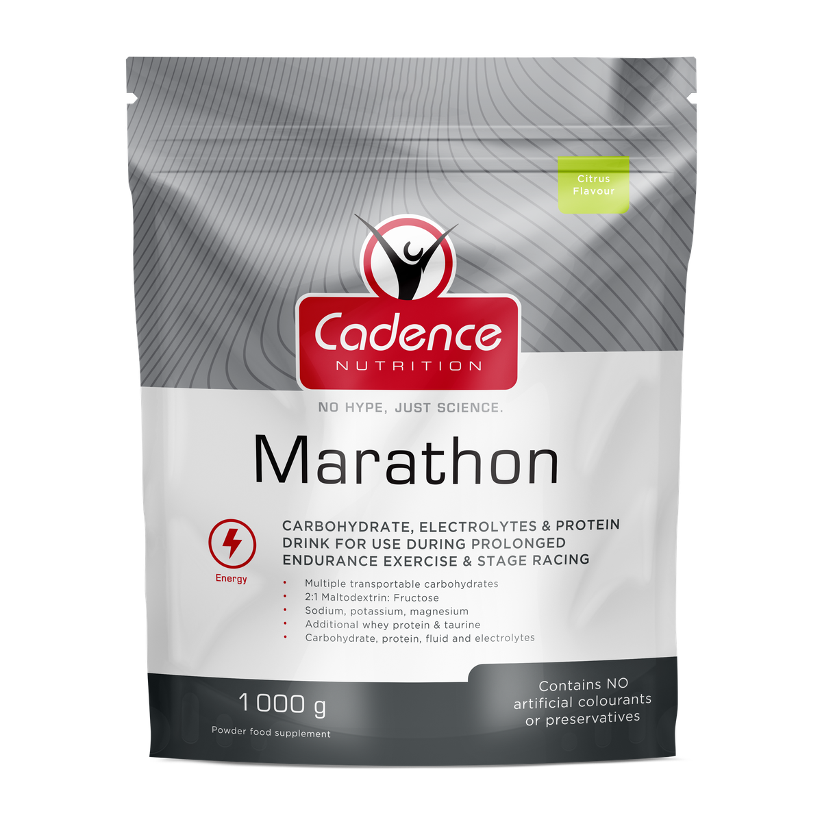 Marathon is a energy drink for endurance racing, stage racing and periods of high training loads. A foundation of multiple transportable carbohydrate and whey protein offers maximal carbohydrate oxidation rates to sustain performance while also providing protein to prevent muscle catabolism and improve performance in multi-day events and during hard training periods. Balanced electrolyte replacement and isotonic formulation complete the picture.