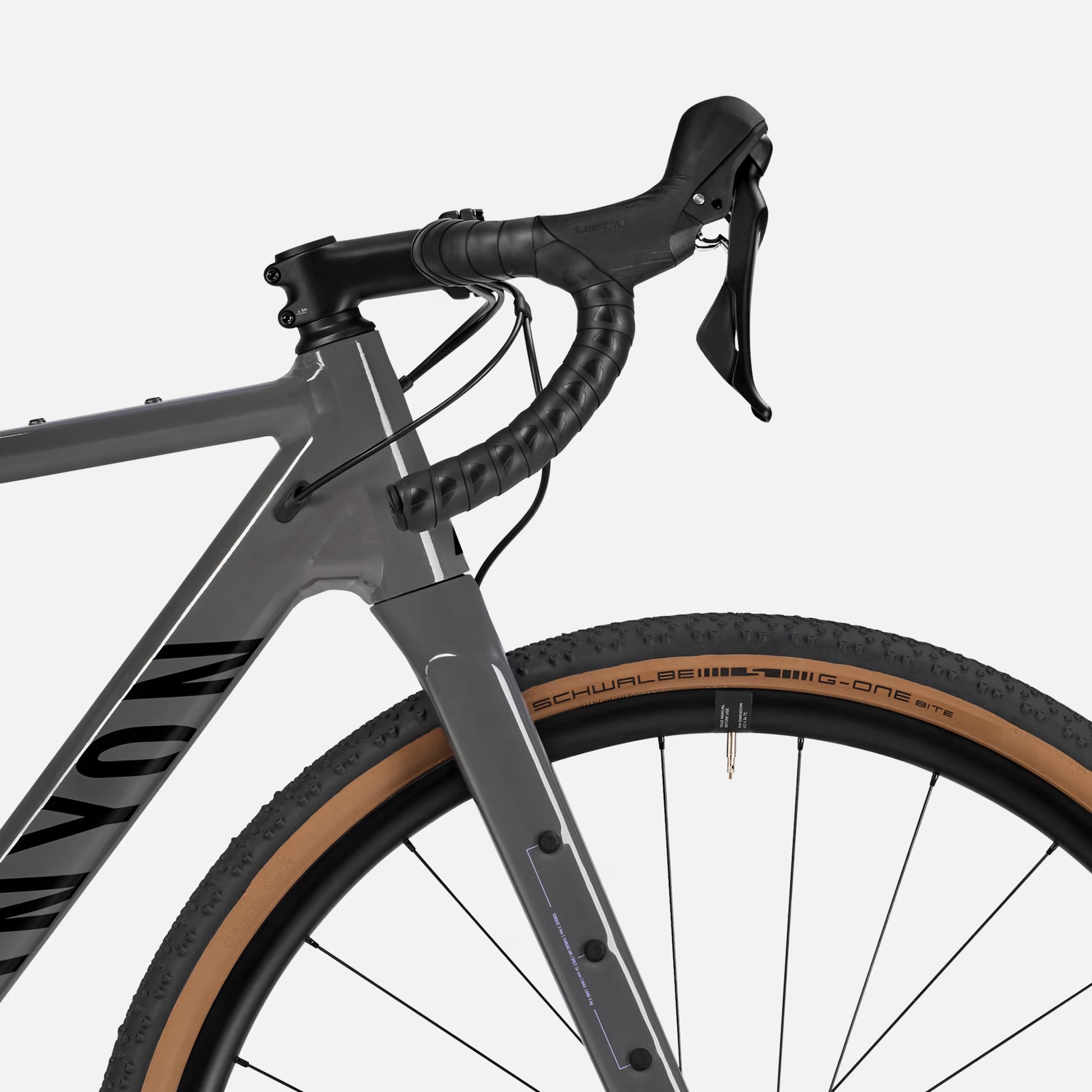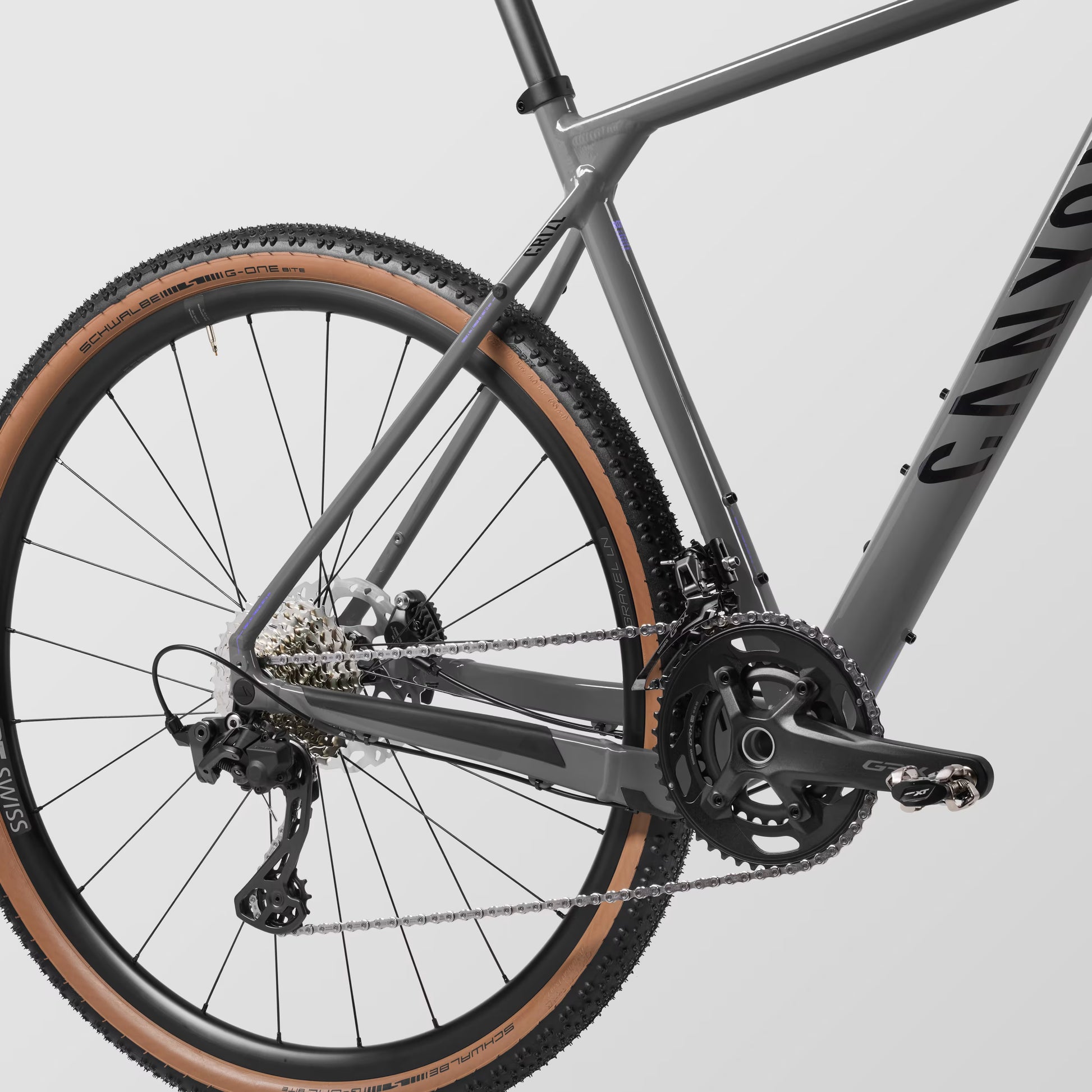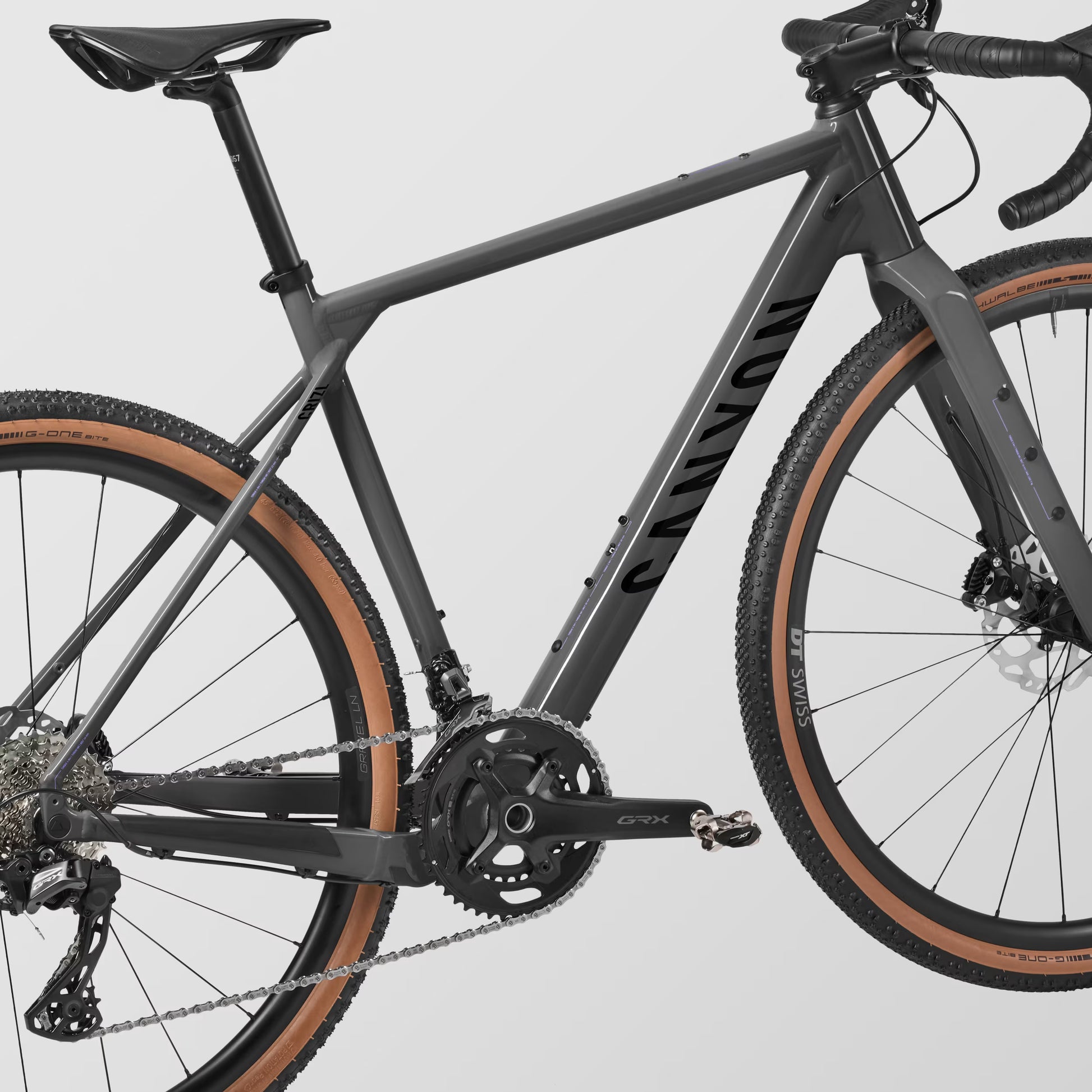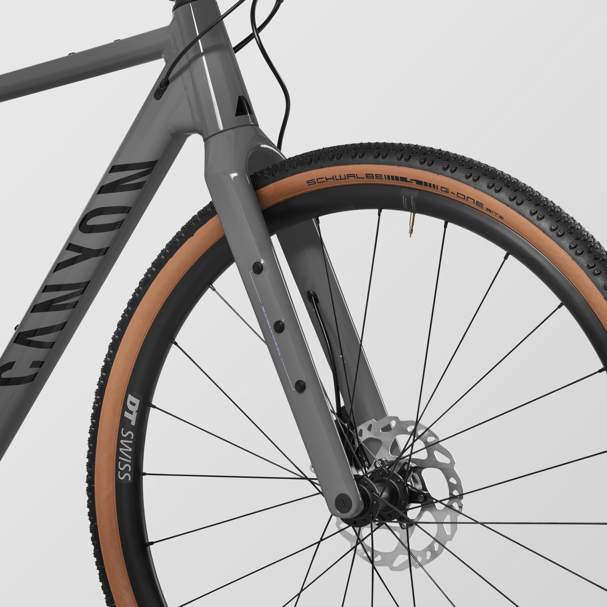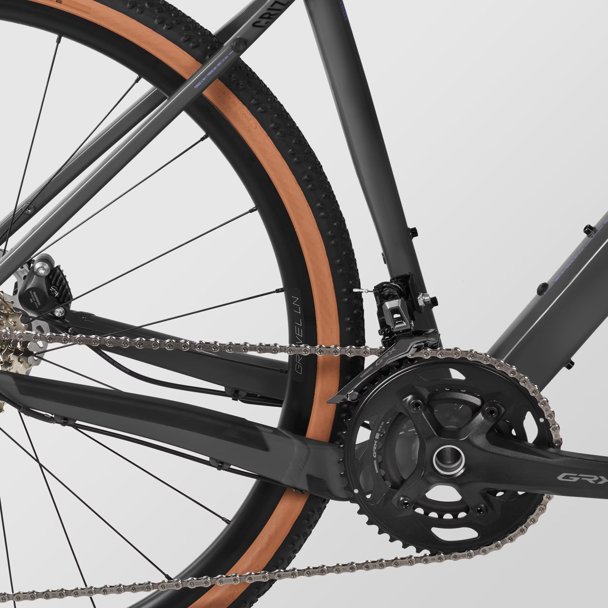 Your tyres, your choice. The Grizl runs 45 mm tyres as standard, with extra clearance for 50 mm rubber for extreme rough gravel riding (max 45 mm with fenders).
