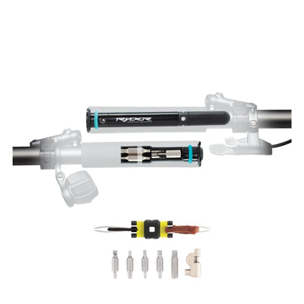 The In-Bar Groovetool features a chain tool, Slugplug Dual and a wide selection of common most-used tools on modern bicycles. Designed to store inside your handlebars, and doubles up as bar plugs.